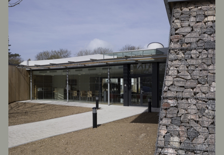 Features include a curved aluminium roof, aluminium guttering, doors and windows, Red Cedar cladding and gabions filled with stone from the adjoining quarry whilst providing a showcase for Hanson concrete products.