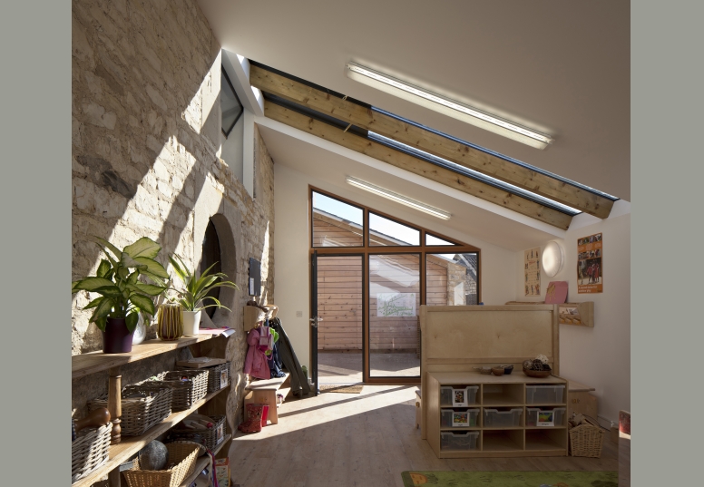 Aaron Evans Architects originally obtained detailed planning and listed building consents for the conversion of the threshing barn and long barn into offices. We were subsequently appointed to prepare alternative proposals converting the threshing barn into a nursery. The complex conversion, which also catered for a small roost of lesser horseshoe bats, was completed Spring 2012 and received full OFSTED certification.