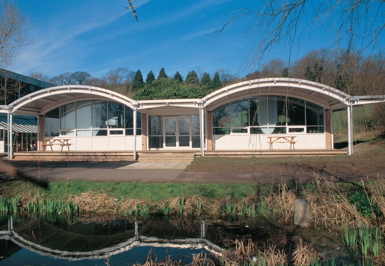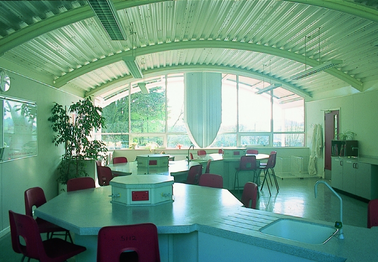 This standalone pavilion houses two science laboratories situated either side of a shared, prep room and comunal foyer. A generous roof covering above the southern elevation and cantilevered canopies over the side walls create shelter for pupils who may have to wait in the open for classes to begin. On a wooded, poolside setting the practice created a focal point for pupils en route to and from classes.