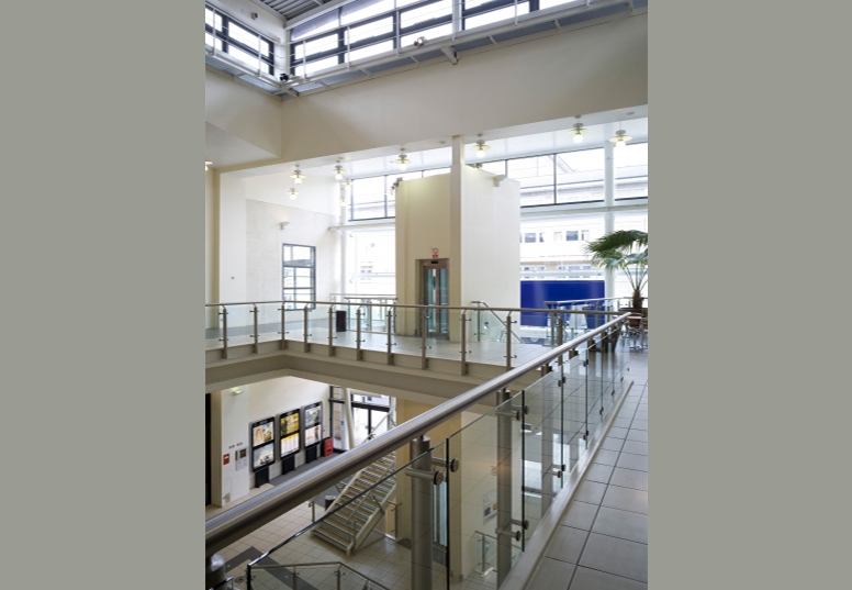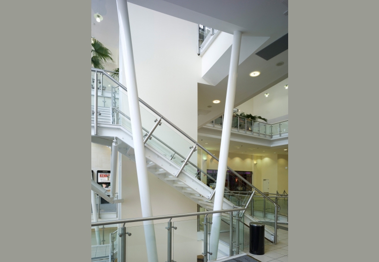 Inspired by the proportions of a Georgian terrace with curving structural glass facade forming the entrance, flanked on either side with elevations in natural stone, it creates a new street elevation of over 50 metres long. Entering the building the visitor finds a central full-height glass atrium rising to a roof five storeys overhead, this atrium gives the feeling of an open courtyard, with restaurants on two floors visible through the transparent walls.