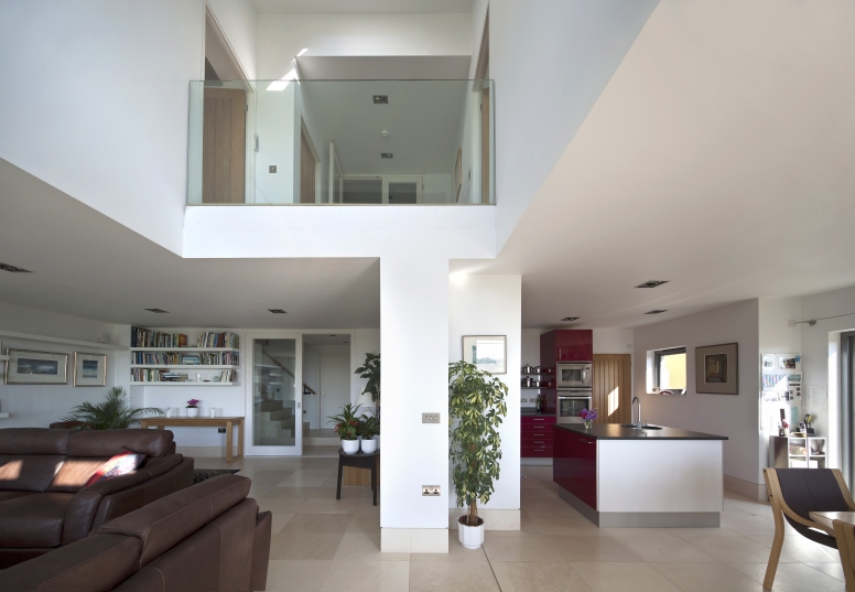 Split level living provides opportunities for double height spaces letting in filtered south light enhanced by the use of light, clean, reflective materials.