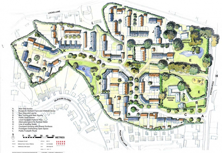 The practice was appointed by a private landowner to prepare an illustrative masterplan in support of an outline planning application for the development of some 140 new homes on open grazing land within the setting of Widham Farm and Widham Grange, both grade II listed buildings. This highly sensitive site sits outside the development boundary but was promoted as a strategic housing site by the landowner. Whilst the application was refused under strategic housing policy, the practice had successfully negotiated all matters of layout, design and conservation impact.
