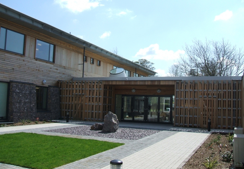 A sustainable commercial building in a semi-rural location. The new building joined to the existing with a glazed link section creating the entrance elevation, opening to a double-height area with a large conical skylight. Features include a curved aluminium roof, aluminium guttering, doors and windows, Red Cedar cladding and stone-filled gabions.